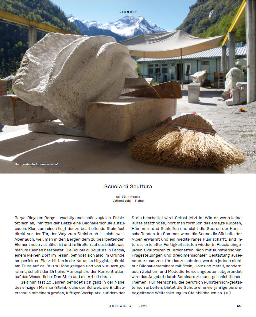 Berge. Ringsum Berge – wuchtig und schön zugleich. Es bietet sich an, inmitten der Berge eine Bildhauerschule aufzubauen. Klar, zum einen liegt der zu bearbeitende Stein fast direkt vor der Tür, der Weg zum Steinbruch ist nicht weit. Aber auch, weil man in den Bergen dem zu bearbeitenden Element noch viel näher ist und im Großen auf das blickt, was man im Kleinen bearbeitet. Die Scuola di Scultura in Peccia, einem kleinen Dorf im Tessin, befindet sich also im Grunde am perfekten Platz. Mitten in der Natur, im Maggiatal, direkt am Fluss auf ca. 800 m Höhe gelegen und von 2000ern gerahmt, schafft der Ort eine Atmosphäre der Konzentration auf das Wesentliche: Den Stein und die Arbeit daran.Seit nun fast 40 Jahren befindet sich ganz in der Nähe des einzigen Marmor-Steinbruchs der Schweiz die Bildhauerschule mit einem großen, luftigen Werkplatz, auf dem derScuola di SculturaCH-6695 PecciaVallemaggia – TicinoStein bearbeitet wird. Selbst jetzt im Winter, wenn keine Kurse stattfinden, hört man förmlich das emsige Klopfen, Hämmern und Schleifen und sieht die Spuren der Kunstschaffenden. Im Sommer, wenn die Sonne die Südseite der Alpen erwärmt und ein mediterranes Flair schafft, sind Interessierte aller Fertigkeitsstufen wieder in Peccia eingeladen Skulpturen zu erschaffen, sich mit künstlerischen Fragestellungen und dreidimensionaler Gestaltung auseinanderzusetzen.Um das zu schulen, werden jedoch nicht nur Bildhauerseminare mit Stein, Holz und Metall, sondern auch Zeichen- und Modellierkurse angeboten, abgerundetwird das Angebot durch Seminare zu kunstgeschichtlichen Themen. Für Menschen, die beruflich künstlerisch-gestalterisch arbeiten, bietet die Schule eine vierjährige berufsbegleitende Weiterbildung im Steinbildhauen an. (JL)LernortScuola di Sculturavon: Deutsches Institut für Erwachsenenbildung (DIE) (Hg.)DOI: 10.3278/WBDIE2104W045https://www.wbv.de/.../WBDIE2104W045/nb/0/category/1582.html